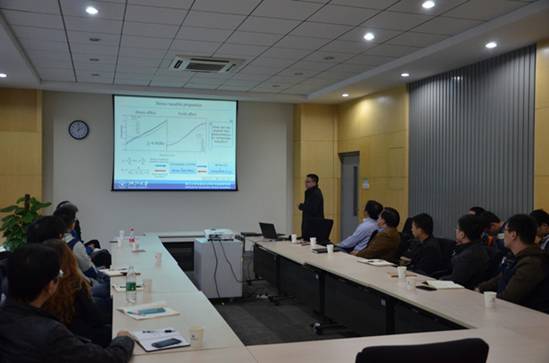 报告中,秦发祥详细介绍了磁性非晶丝巨磁阻抗效应(GMI)调控规律及其形成机制;磁性非晶丝复合材料制备和磁电特性调控规律及其微波吸收特性研究;详尽阐述了集结构和功能一体化的磁性纤维超复合材料的设计,及其在结构健康检测和航天工业等领域的应用。报告会上与会人员就相关问题进行了交流讨论。