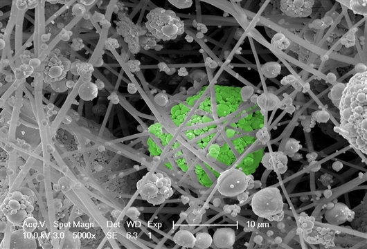 电子显微镜下的静电纺丝和静电喷雾原位组装复合材料。该图曾以《积极抗疫、层层把关》为名在参加宁波市“以物观物——在材料艺术与科学图像之间”展览上展出。曹晋玮/摄